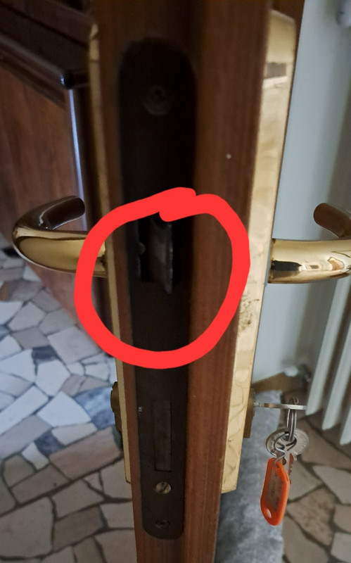 Quel coso è lo scrocco. Girando la maniglia deve rientrare, rilasciandola deve uscire tutto fuori. Nel tuo caso esce solo parzialmente, afferralo con una pinza e tiralo verso l'esterno. Se dopo due o tre manovre torna a funzionare ok, altrimenti devi cambiare la serratura, seguendo quanto detto da Capitan Farloc. Se la trovi identica sarà facile e potrai mantenere le maniglie e nottolino, se non è identica sarà più o meno complicato.paolaok ha scritto:Ci provo...ENRICO51 ha scritto:Probabilmente la molla starata ma spesso il difetto è dovuto a polvere che si accumula nella serratura e si risolve con una pulita e una lubrificata. Se hai dello svitol spruzzalo sullo scrocco e aziona più volte la maniglia ripetendo lo spruzzo. Se non va passa a quanto detto da Capitan Farloc.