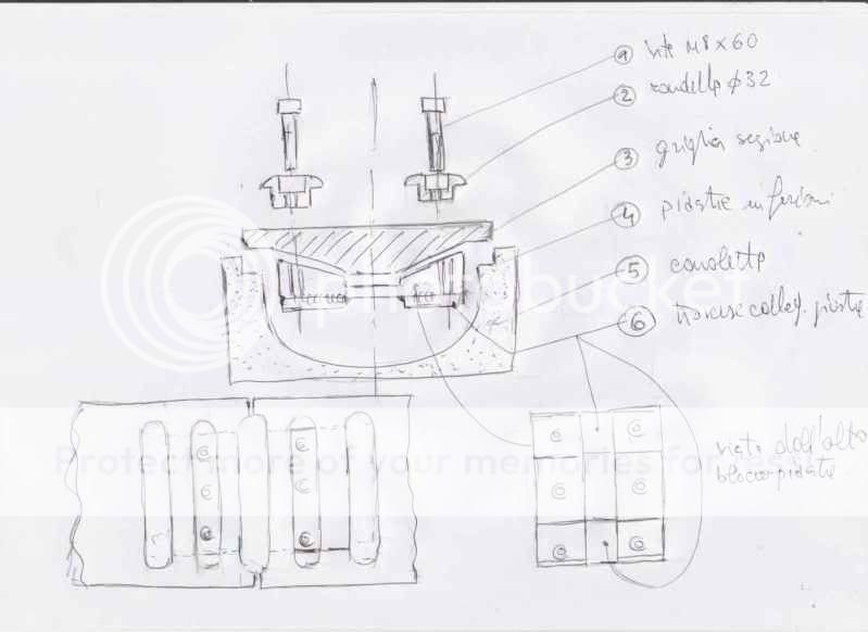 L' unico dubbio che mi sorge è il fatto che con il peso, i tondini "piedi" possano con il tempo spaccare il cemento della canalina, tendendo a far abbassare la griglia, quindi credo che una protezione in gomma o cosa del genere, non sarebbe male......a meno che, i dondini non li cementi direttamente alla canalina!!Facci sapere