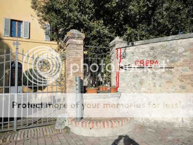 Questa è una foto della crepa, la freccia inganna però il tiro dell'armatura messa dentro il muro per chiuderla, tramite le sbarre dell'inferriata ha tirato la colonna, che essendo appoggiata a pozzo che si vede sulla sua dx, l'ha lesionata e la crepa che prima era sul muro adesso è sulla colonna.